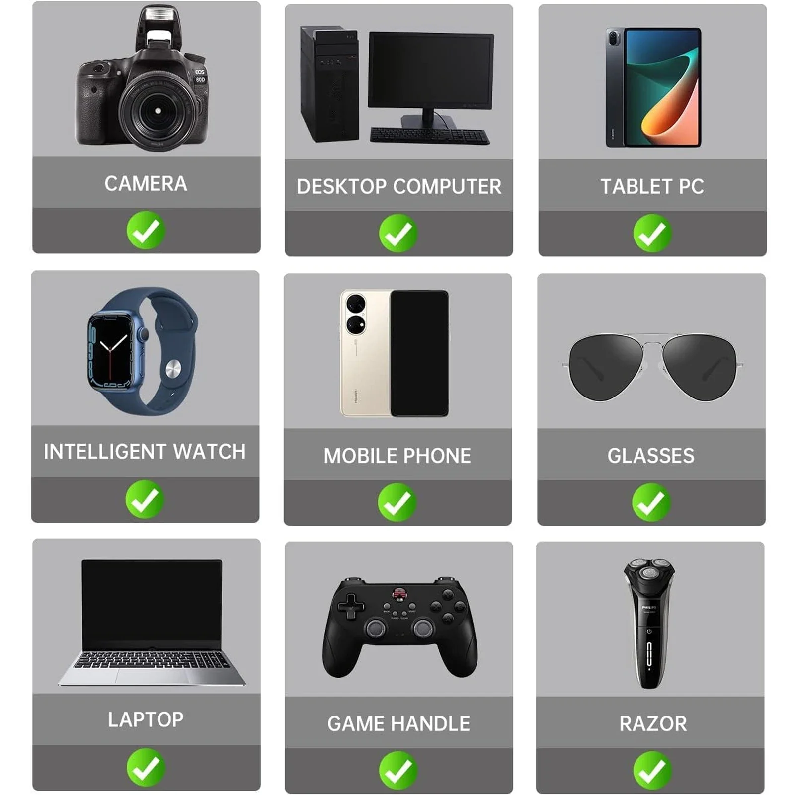 – Adecuado para la mayoría de productos digitales, varios tipos de computadoras, teléfonos móviles, cámaras, gafas y relojes.